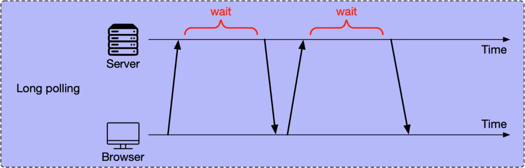 浏览器发送 HTTP 请求后,服务器 挂起连接 直到数据更新或超时,返回响应后浏览器立即发起新请求。