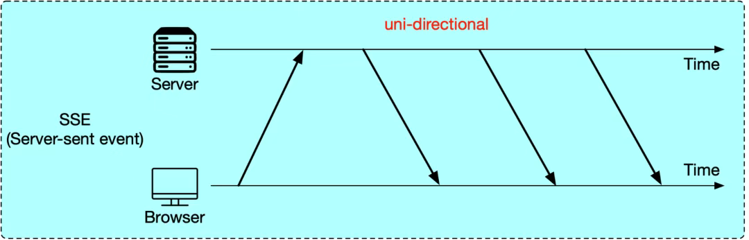 基于 HTTP 协议,服务器可 主动推送 数据流(如Content-Type: text/event-stream),浏览器通过EventSource API 监听。