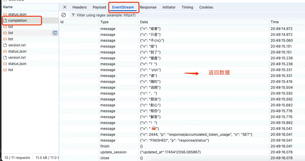 当在 DeepSeek 对话框发送消息后,浏览器会发送一个 HTTP 请求 ,服务端会通过 SSE 方式将数据返回到浏览器。