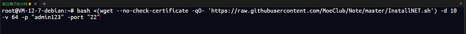 bash <(wget --no-check-certificate -qO- 'https://raw.githubusercontent.com/MoeClub/Note/master/InstallNET.sh') -d 10 -v 64 -p "自定义root密码" -port "自定义<a href="https://www.iigeek.com/archives/tag/ssh"><b style="color:#378e3c">ssh</b></a>端口"